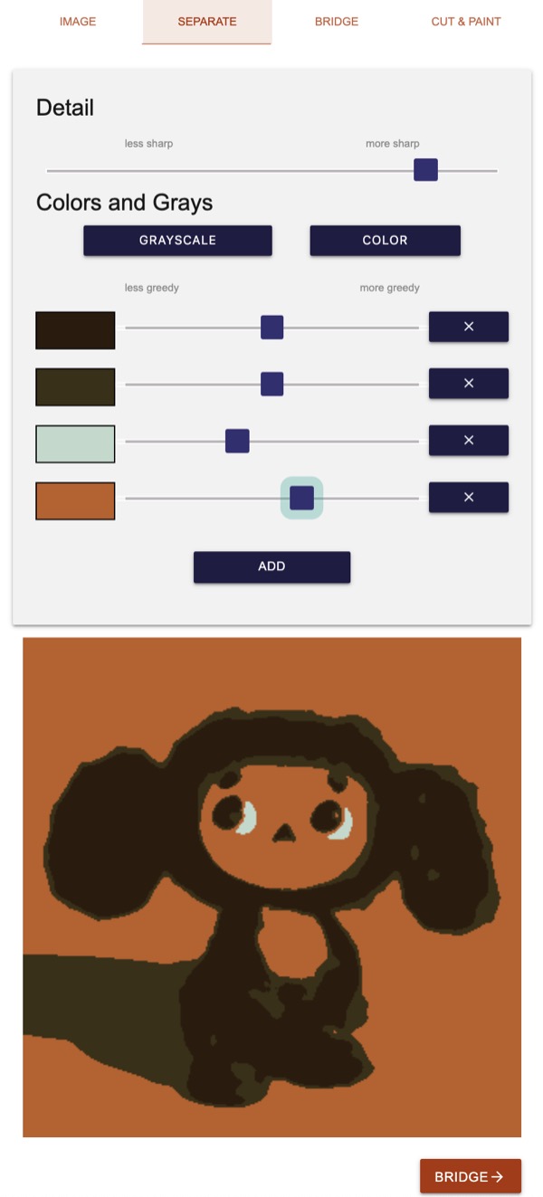 Pick the colors and move the sliders to make that color take up more of the image, or less. You can add colors that are missing. The more colors, the more detail you get. Just keep in mind that three is already a lot of work to cut and paint. Use as few colors as you can.